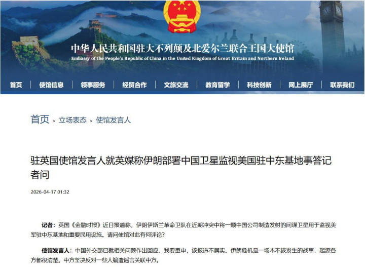 据中国驻英国大使馆17日消息,驻英国使馆发言人就英媒称伊朗部署中国卫星监视美国驻中东基地事答记者问。